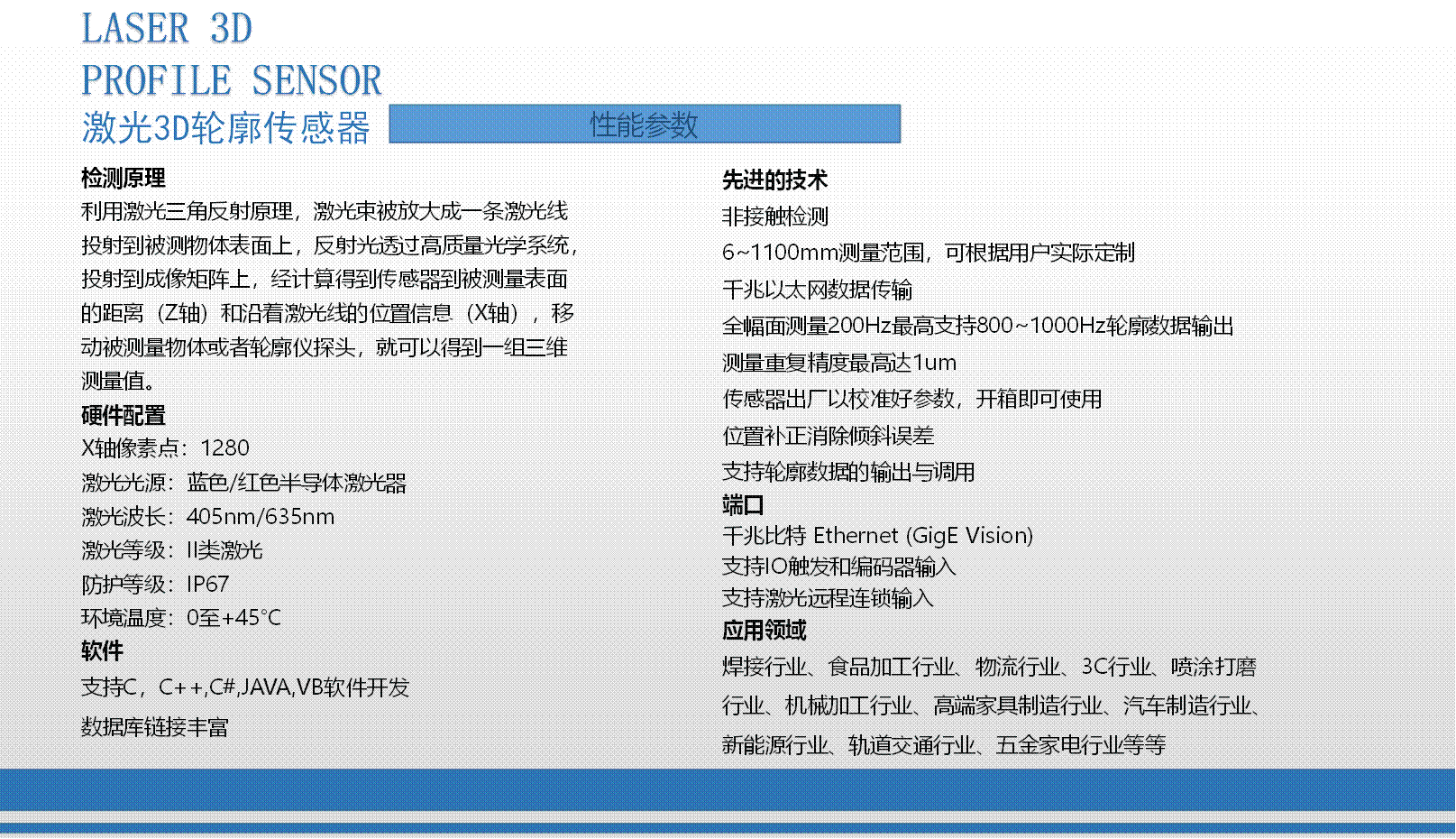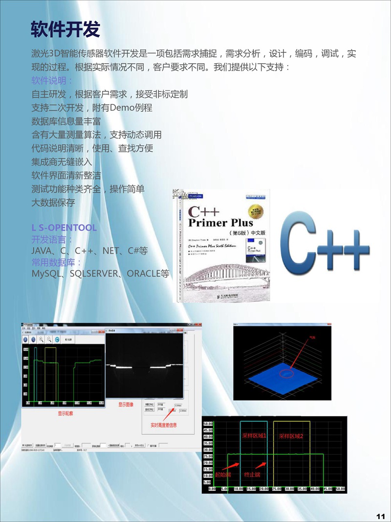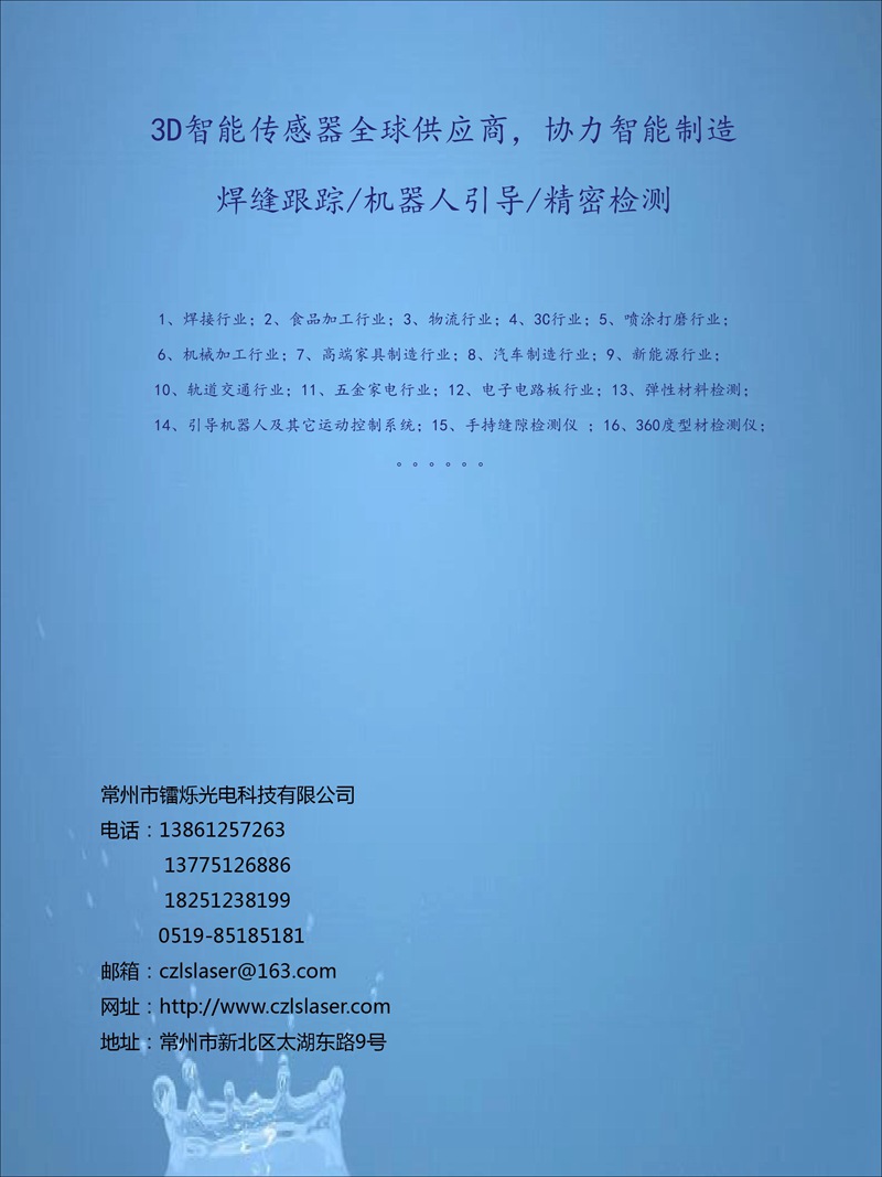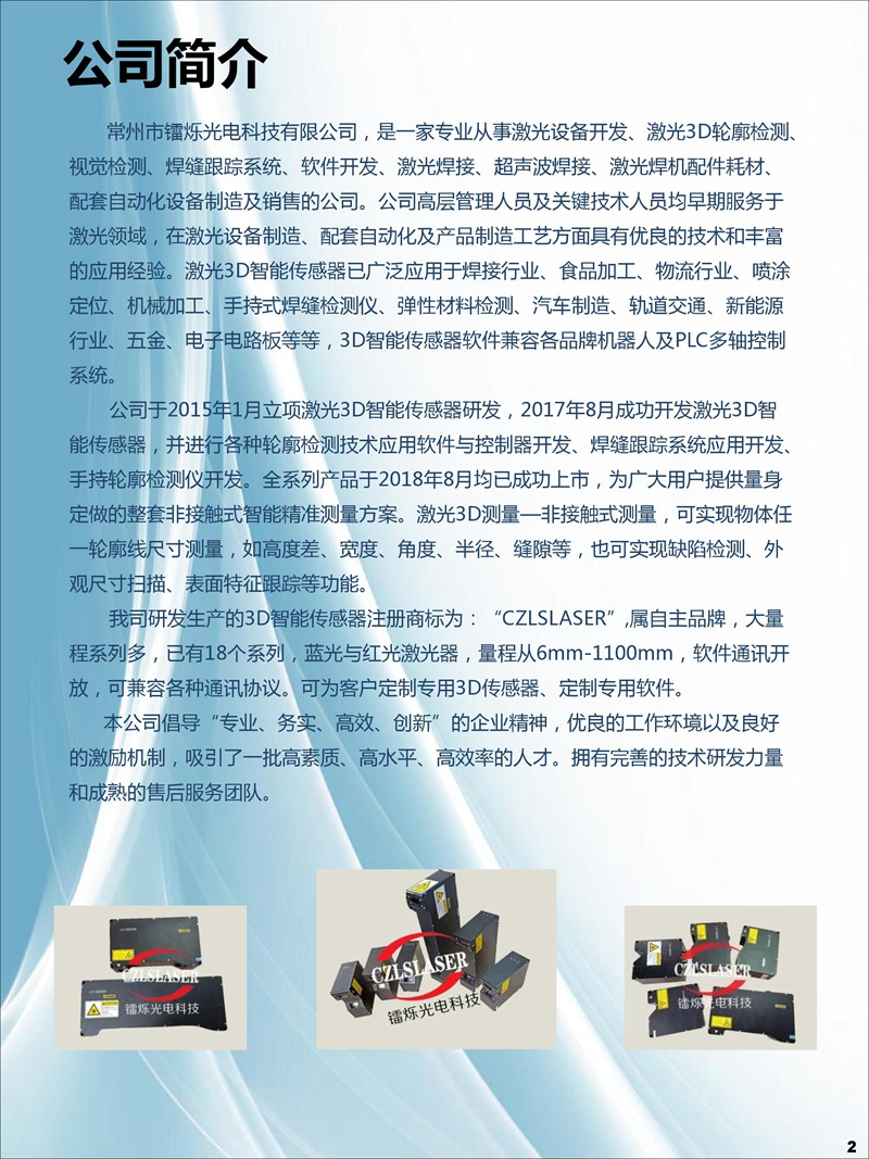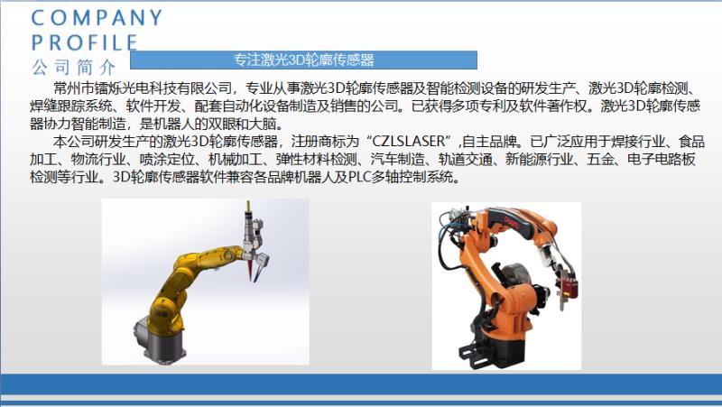 我司研發生產的3D輪廓傳感器注冊商標為:“CZLSLASER”,屬自主品牌,已有18個系列,藍光與紅光激光器,量程從6mm-1100mm,軟件通訊開放,可兼容任意通訊協議。可為客戶定制專用3D傳感器、定制專用軟件。