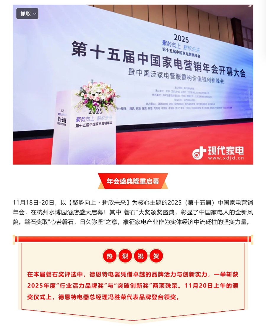 德恩特電器喜獲2025年度中國家電行業磐石獎兩大獎項